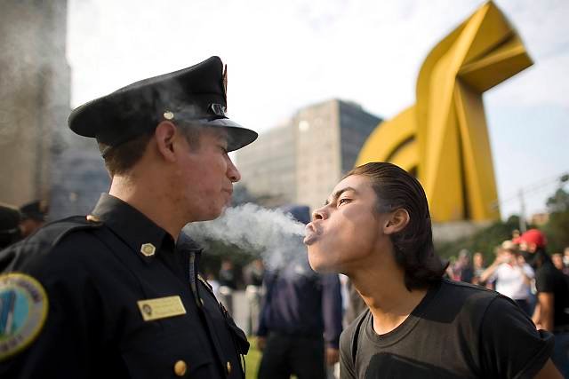 2 października, Mexico City. Nz. student wydmuchuje dym z jointa podczas manifestacji w 40 rocznicę masakry na placu Tlatelolco. 2 października 1968 roku, na 10 dni przed otwarciem Letnich Igrzysk, zginęły setki studentów w starciach z siłami rządowymi.